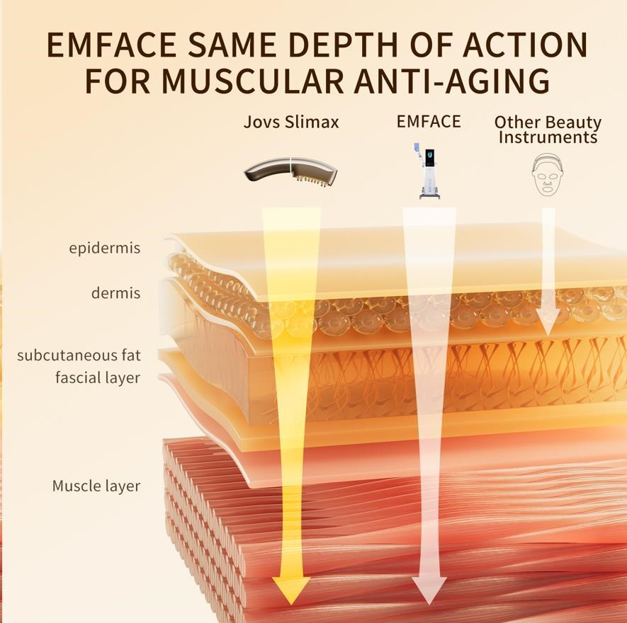 Väčšina kozmetických prístrojov sa zameriava len na dermis, teda na pokožku. Starnutie však začína hlbšie. Ak svaly pod kožou stratia svoju pevnosť, pokožka príde o svoju oporu a začne ochabovať a klesať – bez ohľadu na to, koľko kolagénu obsahuje. JOVS Slimax ako jediný využíva technológiu elektrických pulzných vĺn CET (Collagen Electrophoretic Techniques), ktorá vysiela signály priamo do svalovej vrstvy, stimuluje ich aktivitu a tým obnovuje pevný základ celej tváre.