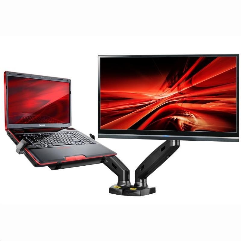 Špičkový stolný držiak do kancelárie, firmy alebo domácnosti pre zavesenie monitora a notebooku. Držiak umožňuje kompletnú polohovateľnosť ako monitora, tak aj notebooku - otáčanie do strán, náklon, dĺžkové a výškové nastavenie, korekciu roviny. Ramenné majú systém na vedenie káblov. Upevnenie je možné na všetky typy stolov alebo dosiek o hrúbke 10 mm až 100 mm, sú možné 2 spôsoby upevnenia - na okraj stolovej dosky alebo kamkoľvek do priestoru (ukotvenie skrze stolovú dosku - nutné prevrtať). Stolný držiak na upevnenie notebooku (laptopu) a monitora Fiber Mounts 764F160 je vynikajúcej kvality, veľmi pekného dizajnu a poskytujeme na neho záruku 5 rokov.
