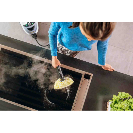 Upratovanie a žehlenie? Plnou parou vpred! Pre SC 5 EasyFix Iron Plug to nie je problém. Tento najvýkonnejší parný čistič vo svojej triede (tlak pár 4,2 bar) je totiž vybavený aj možnosťou pripojenia tlakovej parnej žehličky. Dôkladné čistenie parným čističom Kärcher odstráni 99,999 % vírusov* a 99,99 % všetkých bežných domácich baktérií** z typických tvrdých povrchov v domácnosti. Pomocou rôzneho príslušenstva budú dlaždice, varné dosky, odsávače pár a dokonca aj tie najmenšie škáry bezchybne čisté, či už sú na nich ľahké alebo odolné nečistoty. podlahová hubica EasyFix s flexibilným kĺbom umožňuje ergonomickú prácu. A lamelová technológia zaručuje dokonalé výsledky čistenia. Handrička na čistenie podláh sa dá ľahko nasadiť na podlahovú hubicu a opäť zložiť, aniž by musela prísť do kontaktu so špinou. Funkcia VapoHydro odstraňuje odolné nečistoty ešte jednoduchšie pridaním horúcej vody. Intenzitu pary je možné prispôsobiť povrchu a nečistotám. Odnímateľnú nádržku na vodu je možné trvalo dopĺňať - pre neprerušované čistenie. Ďalšie doplnky: integrovaná priehradka na kábel, priehradka na príslušenstvo, parkovacia poloha pre podlahovú hubicu.