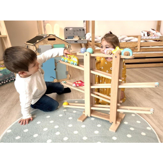 Drevená gulôčková dráha XL s originálnymi prvkami v podobe skvelého závodného autíčka a autobusu so zvieratkami zo ZOO ZDARMA nadchne každé dieťa. Gulôčková dráha z tvrdého prírodného dreva s 7 zábavnými prvkami v krásnych farbách zabezpečí zábavu nielen vašej holčičke alebo chlapcovi, ale aj celej rodine. Stačí správne umiestniť guľôčku, kvetinu, závodničku alebo bus na začiatok dráhy a potom len sledovať, akou rýchlosťou zdolá všetky poschodia.