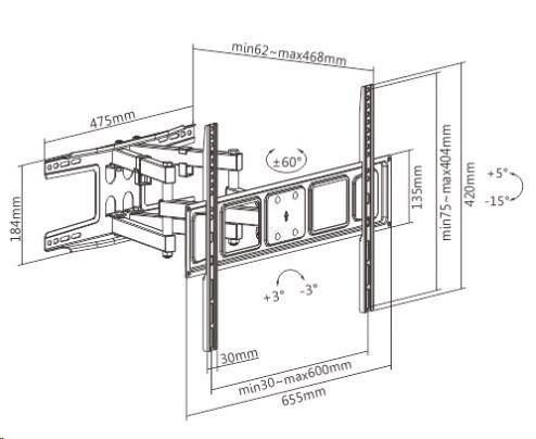 Kvalitný nástenný držiak na televíziu Fiber Mounts Solid-2 Otočný, sklopný, výsuvný držiak Tv 43-85" s pevnou a bezpečnou konštrukciou Držiak vhodný na zavesenie televízie na stenu do obývačky, izby alebo kancelárie. Držiak Tv Fiber Mounts Solid-2 sa vyznačuje kvalitnou robustnou konštrukciou s veľkou nástennou plochou pre spoľahlivú inštaláciu a umožňuje pomerne jednoduchú úpravu polohy televízie otáčaním do strán, naklápaním a vysúvaním alebo naopak priskrutkovaním ku stene. V prípade nerovností alebo nepresnej inštalácie umožňuje držiak korigovať rovinu obrazovky. Na držiak Solid-2 môžete zavesiť všetky televízory s hmotnosťou do 40kg, ktoré majú VESA od 100x100 do 600x400 – ideálne sú televízory s uhlopriečkou 43" až 85". Farebné prevedenie čierne, záruka 5 rokov. Držiak na televízor, ktorý vynikne skutočne solidnou pevnou konštrukciou - otáčanie Tv do strán, naklápanie, vysúvanie od steny - Fiber Mounts Solid-2 Technické údaje: nosnosť 40kg podpora VESA štandardov 100x100 až 600x400 ideálne na Tv s uhlopriečkou 43" až 85" polohovanie vzdialenosti od steny od 62mm do 468mm otáčanie televízora do strán +/- 60° naklápanie televízora smerom nadol až o 15° a nahor až o 5° úprava roviny obrazovky +/- 3° úchyty na káble robustná, spoľahlivá a bezpečná konštrukcia ľahké zavedenie televízora na stenu ľahké polohovanie televízora ľahká inštalácia na stenu dodávame vrátane inštalačného materiálu farebné prevedenie čierne záruka 5 rokov Oceľový nástenný držiak poctivej konštrukcie Fiber Mounts Solid-2 Televízia držiak Fiber Mounts Solid-2 podporuje VESA štandardy: VESA 100x100 VESA 100x200 VESA 200x100 VESA 200x200 VESA 200x300 VESA 200x400 VESA 300x200 VESA 300x300 VESA 400x200 VESA 400x400 VESA 600x400