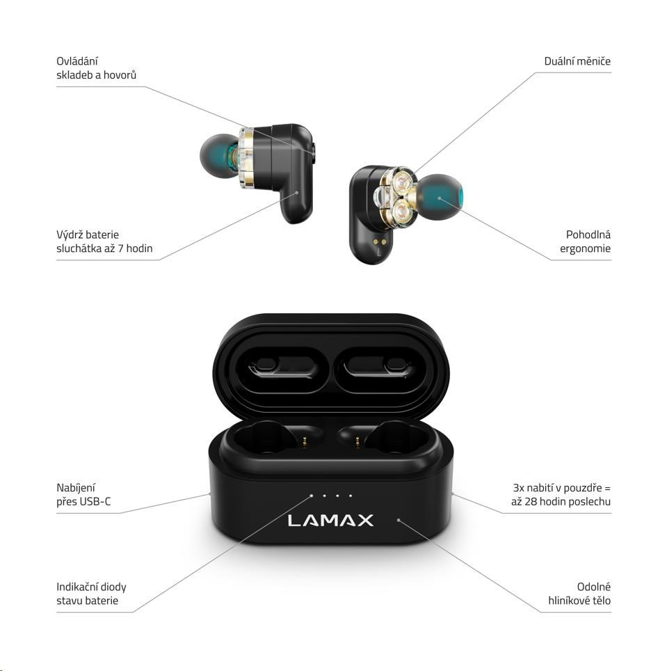 Zdvojnásobí tvoj hudobný zážitokNačúvaj! Duálne meniče pošlú tvojím bubienkom dvojnásobnú hudobnú nálož. Dunivé basy, krištáľovo čisté výšky bez skreslenia a v extra rozsahu. To je sound, ktorý si ťa vo chvíli získa. Nemusíš si hovoriť audiofil, aby si poznal, o koľko lepšie hrajú LAMAX Duals1. K tomu si pripočítaj až 28 hodín počúvania bez nabíjačky alebo luxusný techy dizajn s odhaleným telom a máš jasno, aké bezdrôtové slúchadlá chceš.