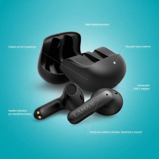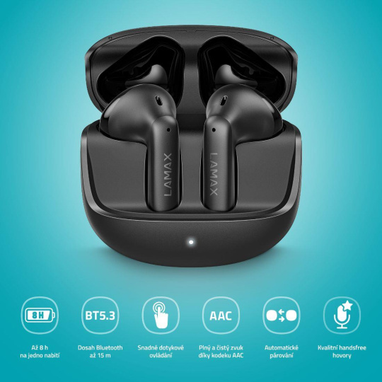 Nebuďte bez hudby ani minútuBezdrôtové slúchadlá LAMAX Tones1 sú dokonalé slúchadlá LAMAX! S rýchlym pripojením Bluetooth 5.3 a dosahom 15 metrov si na jedno nabitie vystačíte až na 8 hodín bezproblémového počúvania. Potrebujete viac? V puzdre na vás čaká ďalších 32 hodín. Vychutnajte si vynikajúci zvuk kdekoľvek a kedykoľvek, či už pracujete alebo sa hráte. Vďaka kvalitnému mikrofónu a jednoduchému ovládaniu stačí stlačiť tlačidlo prehrávania a vyraziť!
