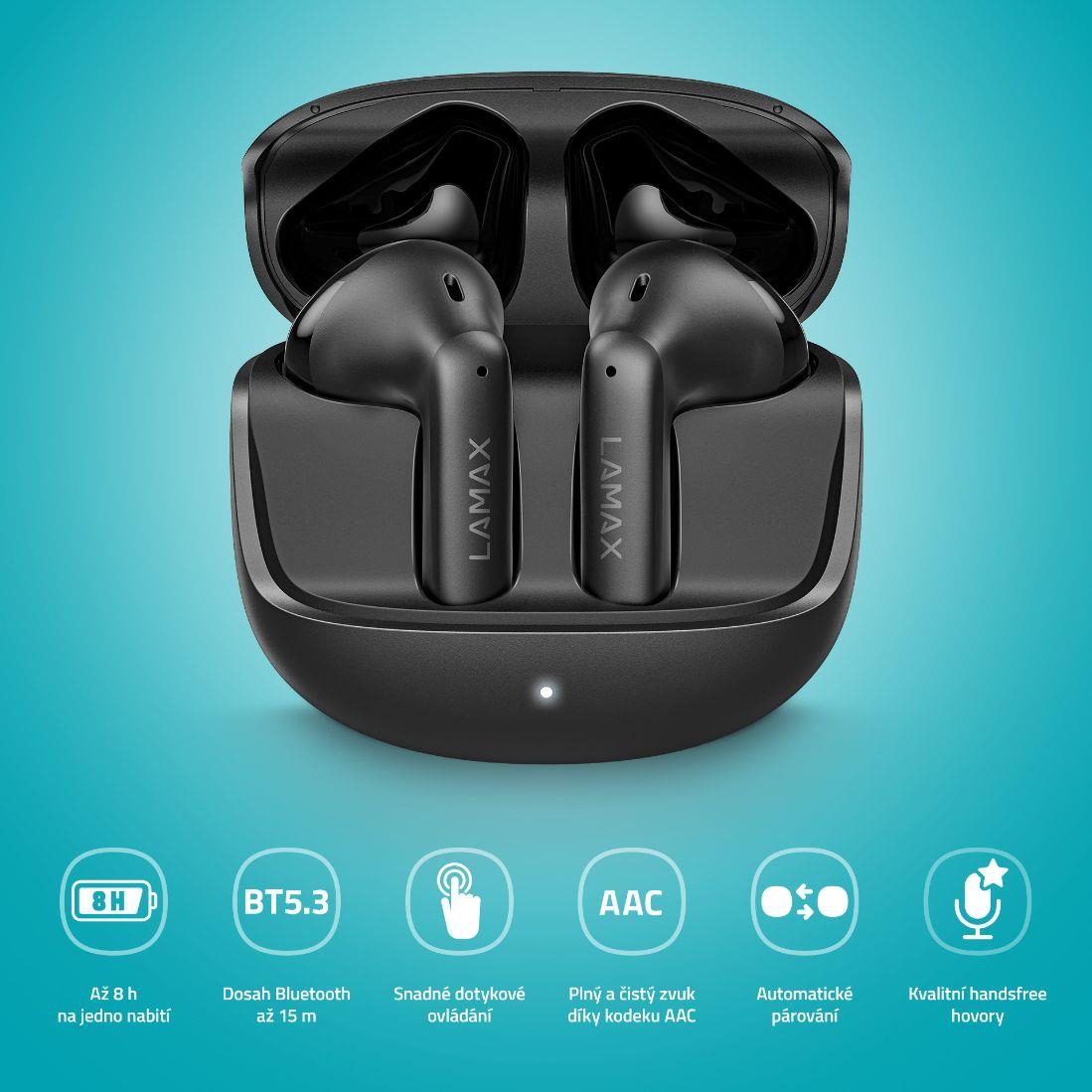Nebuďte bez hudby ani minútuBezdrôtové slúchadlá LAMAX Tones1 sú dokonalé slúchadlá LAMAX! S rýchlym pripojením Bluetooth 5.3 a dosahom 15 metrov si na jedno nabitie vystačíte až na 8 hodín bezproblémového počúvania. Potrebujete viac? V puzdre na vás čaká ďalších 32 hodín. Vychutnajte si vynikajúci zvuk kdekoľvek a kedykoľvek, či už pracujete alebo sa hráte. Vďaka kvalitnému mikrofónu a jednoduchému ovládaniu stačí stlačiť tlačidlo prehrávania a vyraziť!