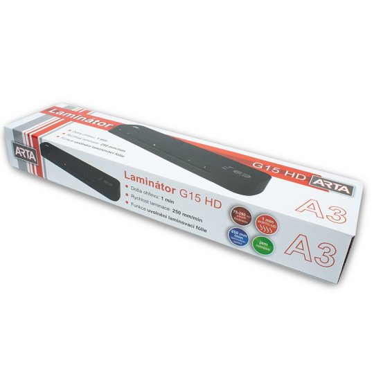Laminátor dokumentov s možnosťou voľby hrúbky laminovacej fólie. Model ARTA G15 HD A3 umožňuje laminovanie dokumentov, ktoré majú maximálnu šírku 330 mm (A3), s fóliami o hrúbke 75 až 250 mikrónov. Doba potrebná na ohrev je len 60 sekúnd. Je ľahko použiteľný, kompaktný a vyznačuje sa prítomnosťou inteligentnej funkcie automatického vypnutia po 30 minútach nečinnosti. Súčasťou je aj možnosť uvoľnenia zaseknutých dokumentov.