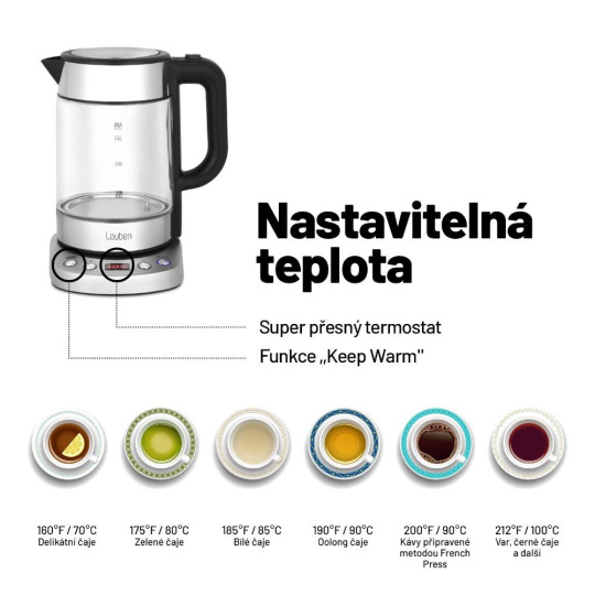 Lauben Electric Kettle EK17GS je dizajnová rýchlovarná konvica s nastaviteľnou teplotou ohrevu vody a Keep Warm funkciou. Možnosť nastavenia teploty vody v kuchyni určite oceníte. Potrebujete zalejeť zelený čaj? Už nikdy nemusíte čakať, až voda vychladne, stačí si preferovanú teplotu zvoliť na prehľadnom LCD displeji.