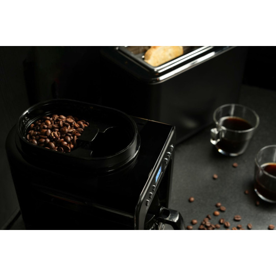 Prevádzka kávovaru je úplne bezpečná, technológia Cool Touch udržuje povrch prístroja chladný, nemôže teda prísť k popáleniu. Ak by ste zabudli kávovar vypnúť, žiadnu paniku, disponuje funkciou automatického vypnutia. Ukazovateľ hladiny vody poskytuje prehľad o tom, či ju treba doplniť. Kávovar sa pýši kompaktnými rozmermi a prémiovým minimalistickým dizajnom s matným čiernym povrchom. Aj keď nie je obor a na linke tak zostane veľa miesta, funkciami si v ničom nezadá s oveľa väčšími kolegami. Vďaka možnosti umývania v umývačke sa ľahko udržuje a umývateľný filter z nerezovej ocele šetrí peniaze aj životné prostredie, stačí vám totiž jeden navždy. Koniec neekologických jednorazových filtrov.