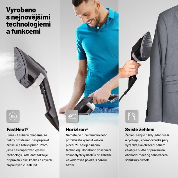 Nie je čas strácať čas, preto je tu technológia FastHeat®. Vďaka nej je prístroj schopný akcie do 20 sekúnd od zapnutia, nech ste kdekoľvek. Niekedy jednoducho nie je po ruke vešiak alebo je plocha tak veľká, že klasické žehlenie je nepraktické. Potom prichádza technológia HorizIron®, s ktorou dosiahnete dokonalé výsledky aj horizontálnym naparovaním či žehlením nasucho.