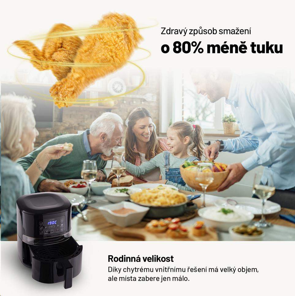 Až o 70% menej elektrickej energie oproti rúre; až o 85% menej tuku a o 50% rýchlejšie hotové.