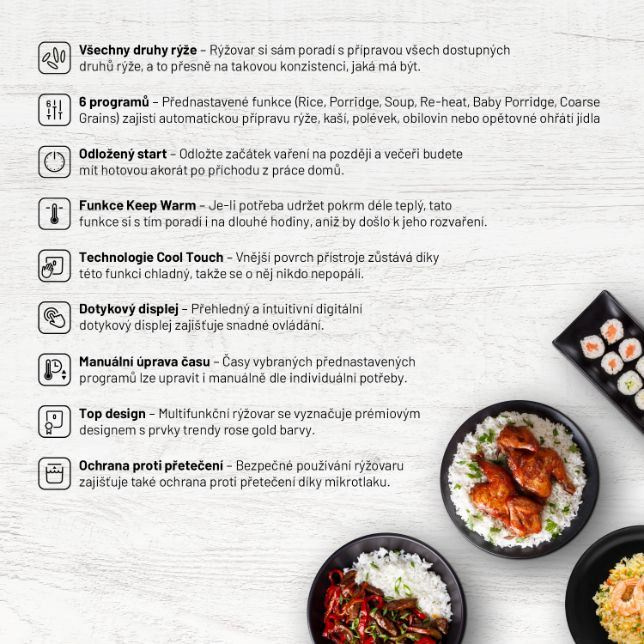 Varte s ľahkosťou, chutne a štýlovoEfektivita, jednoduché použitie a dizajn majú spoločného menovateľa, je ním viacúčelový ryžovar Lauben Multifunction Rice Cooker 1200WR Rose Gold Edition. Stlačením jediného tlačidla uvarí všetky druhy ryže na správnu tvrdosť a 6 prednastavených funkcií vykúzli ďalšie pokrmy ako kaša alebo polievky. Čas niektorých programov si však na intuitívnom dotykovom displeji môžete nastaviť aj manuálne. Vďaka funkcii odloženého štartu je možné mať jedlo pripravené už po návrate domov, oneskorenci zase ocenia funkciu Keep Warm, ktorá udrží pokrm teplý bez rozvarenia. Porcie nasýtia jednotlivcov i páry, ktoré potom majú viac času pre seba, pretože ani údržba nezaberie čas. Vnútorný hrniec je možné dať do umývačky. Bezpečné používanie zaisťuje ochrana proti pretečeniu a technológia Cool Touch proti popáleniu. Ryžovar bude ozdobou každej kuchyne, ktorú rozžiari trendy rose gold farbou a pritom nezaberie takmer žiadne miesto.