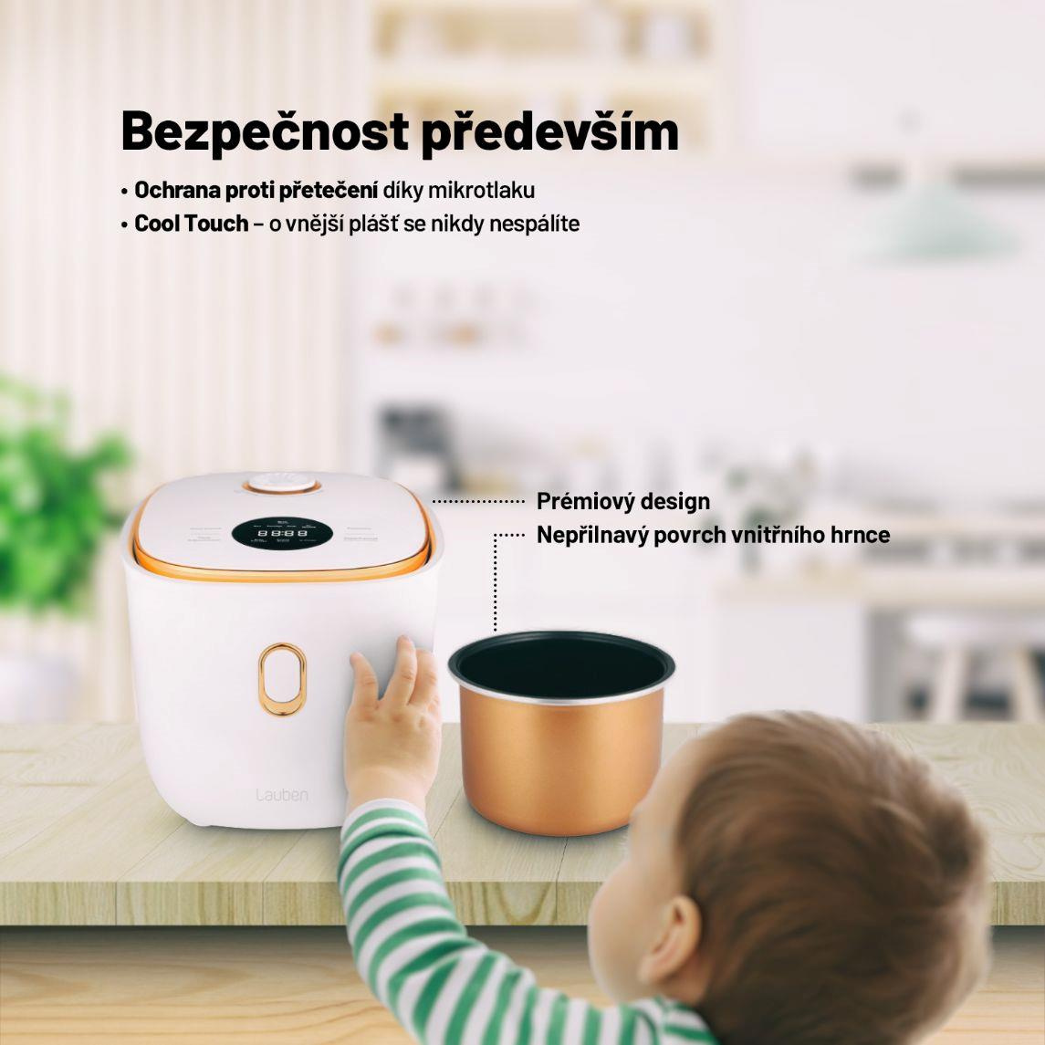 Varte s ľahkosťou, chutne a štýlovoEfektivita, jednoduché použitie a dizajn majú spoločného menovateľa, je ním viacúčelový ryžovar Lauben Multifunction Rice Cooker 1200WR Rose Gold Edition. Stlačením jediného tlačidla uvarí všetky druhy ryže na správnu tvrdosť a 6 prednastavených funkcií vykúzli ďalšie pokrmy ako kaša alebo polievky. Čas niektorých programov si však na intuitívnom dotykovom displeji môžete nastaviť aj manuálne. Vďaka funkcii odloženého štartu je možné mať jedlo pripravené už po návrate domov, oneskorenci zase ocenia funkciu Keep Warm, ktorá udrží pokrm teplý bez rozvarenia. Porcie nasýtia jednotlivcov i páry, ktoré potom majú viac času pre seba, pretože ani údržba nezaberie čas. Vnútorný hrniec je možné dať do umývačky. Bezpečné používanie zaisťuje ochrana proti pretečeniu a technológia Cool Touch proti popáleniu. Ryžovar bude ozdobou každej kuchyne, ktorú rozžiari trendy rose gold farbou a pritom nezaberie takmer žiadne miesto.