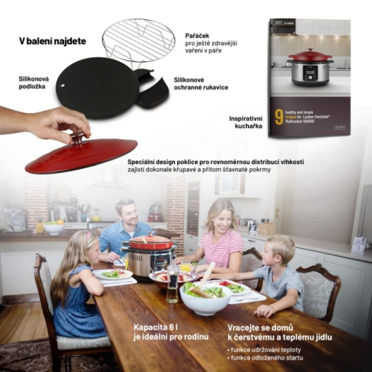 Viacúčelový Lauben OvenSafe® Multicooker 6000RS rozhodne nerobí hanbu svojmu označeniu. Vnútorný hrniec je poctivý liatinový so smaltovaným povrchom - ako od babičky! Vďaka technológii OvenSafe® je možné ho bez obáv vložiť do rúry či postaviť na rôzne typy sporákov, zvláda teplotu až 250°C. Pretože je 21. storočie v plnom prúde, nádobu s objemom 6 l je možné vložiť aj do multicookeru a razom máte k dispozícii 10 prednastavených programov pre jednoduché a rýchle varenie. Teplotu a čas je však možné upraviť aj ručne. Dôležitou súčasťou hrnca je pokrievka, tá je navrhnutá tak, aby k distribúcii vlhkosti vo vnútri dochádzalo rovnomerne. Liatina dokonale absorbuje a vedie teplo a tým je varenie energeticky úspornejšie, smaltovaný povrch zabraňuje korózii. Jedlo pripravíte ľahko aj v pare vďaka priloženému paráčiku. Šikovnými pomocníkmi sú funkcia na udržiavanie teploty a dložený štart. Manipuláciu uľahčujú priložené silikónové rukavice a podložka, inšpiráciu prináša kuchárka.