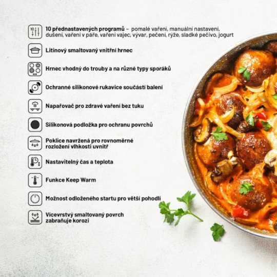 V multicookeri môžete variť maximálne zdravo, teda bez tuku a v pare vďaka špeciálnemu paráčiku, ktorý je súčasťou balenia. Príprava jedla je zároveň veľmi bezpečná, stačí využívať pribalené ochranné silikónové rukavice a silikónovú podložku. Aby vám hrniec naozaj dlho vydržal, je vybavený viacvrstvovým smaltovaným povrchom, ktorý zabraňuje hrdzaveniu. Varenie s týmto pomocníkom je hračka, ale ak by vám chýbala spočiatku inšpirácia, v priloženej kuchárke nájdete ľahké a zdravé recepty.