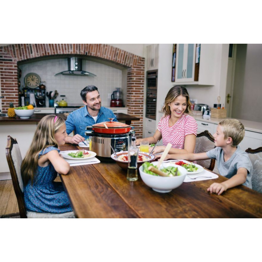 Súčasťou elektrického multicookera je OvenSafe® liatinový smaltovaný vnútorný hrniec, ktorý odoláva teplotám až 250°C a hodí sa aj pre použitie v rúre či na rôznych typoch sporákov. Liatina oplýva schopnosťou absorbovať teplo a odovzdávať ho surovinám vo vnútri, ktoré sa tak pripravujú pri konštantnej teplote. Dochádza k úspore energie a tým aj peňazí. Šťavnatosť a chrumkavosť jedlám zaisťuje špeciálna pokrievka, ktorá je navrhnutá tak, aby dochádzalo k rovnomernej distribúcii vlhkosti vo vnútri hrnca.