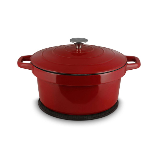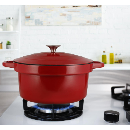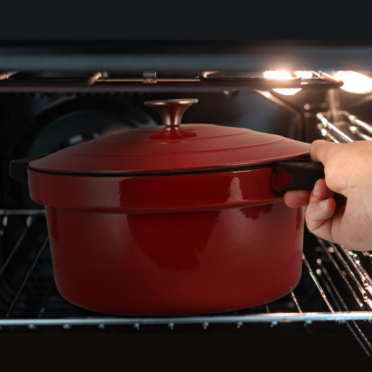 Liatinový 6l smaltovaný vnútorný hrniec je možné bez problémov vybrať a vložiť do rúry či postaviť na rôzne typy sporákov. Vydrží teplotu až 250°C.