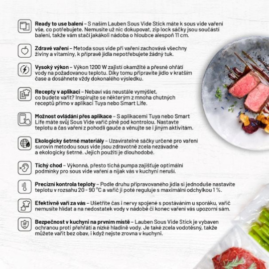 Chcete si vychutnať vynikajúce, zdravé jedlo, ktorého príprava vám nezaberie celý popoludnie? Chcete si doma pripraviť mäso, čo sa bude rozpadávať na jazyku, ale pritom nezničí objem a vždy si zachová svoj tvar a farbu? Nemusíte nutne chodiť do reštaurácie. Lauben Smart Sous Vide je ideálnym pomocníkom do kuchyne pre každého, kto chce ušetriť hodiny strávené pri sporáku, a predsa získať z ingrediencií maximum. Vďaka metóde varenia sous vide si pripravené jedlá zachovajú všetky chute, vône a živiny, o ktoré nechcete pri varení prísť. Varič jednoducho zapnete a ponoríte do hrnca s potravinami pripravenými vo špeciálnych zip lock vakoch, ktoré sú súčasťou balenia. O ostatné sa postará Lauben Smart Sous Vide, vy si len vychutnáte famózny výsledok.