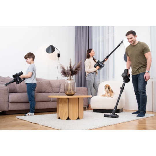 Univerzálny motorizovaný kefka je vhodný pre všetky druhy podláh vrátane tých, na ktorých sa pohybujú domáci maznáčikovia. Nielen ich chlpy bezpečne odstráni hlavica so systémom proti zamotávaniu vlasov. Uľahčuje upratovanie flexibilná tyč s kĺbom a zbieracia nádoba umiestnená v hornej časti, takže vysávač sa ľahko dostane aj pod nábytok a do úzkych priestorov. Vďaka prevedeniu bez káblov a možnosti premeny na ručný vysávač je možné ho použiť kdekoľvek, napríklad pri čistení auta. Vydrží až 35 minút na jedno nabitie.