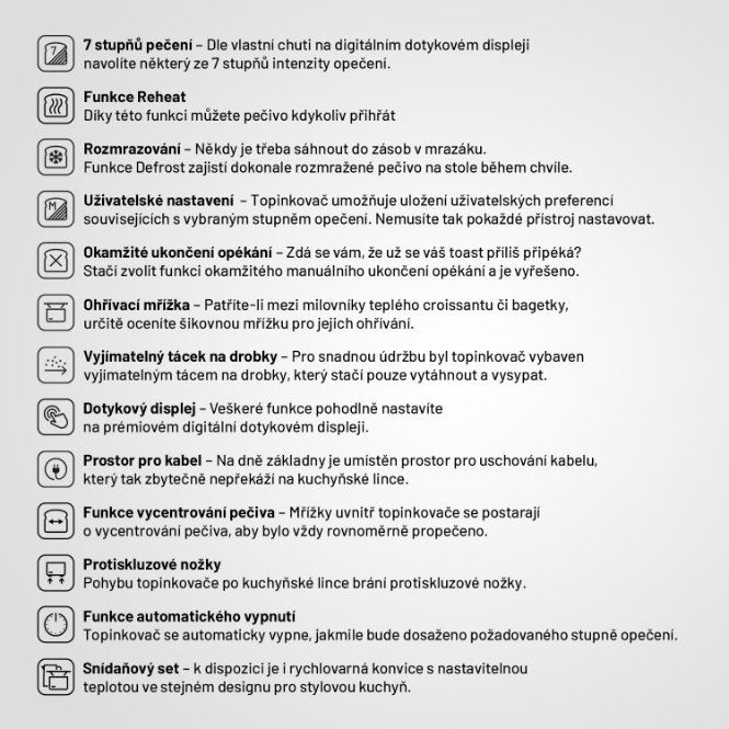 V topinkovači rýchlo pripravíte dokonalý chrumkavý toast presne tak, ako máte radi. Stačí nastaviť jeden zo 7 stupňov intenzity. Svoje preferencie si potom uložíte na ďalšie použitie. Ak skúšate nový chlieb a pripéká sa, môžete kedykoľvek ručne prerušiť opekanie. Nestiháte? Nevadí, s funkciou Reheat môžete pečivo ľahko prehriatie. Niekedy je tiež potrebné vytiahnuť pečivo z mrazničky, v takom prípade príde na rad funkcia Defrost. Nesmieme zabudnúť na ohrevnú mriežku, na ktorej si môžete pripraviť teplý croissant.