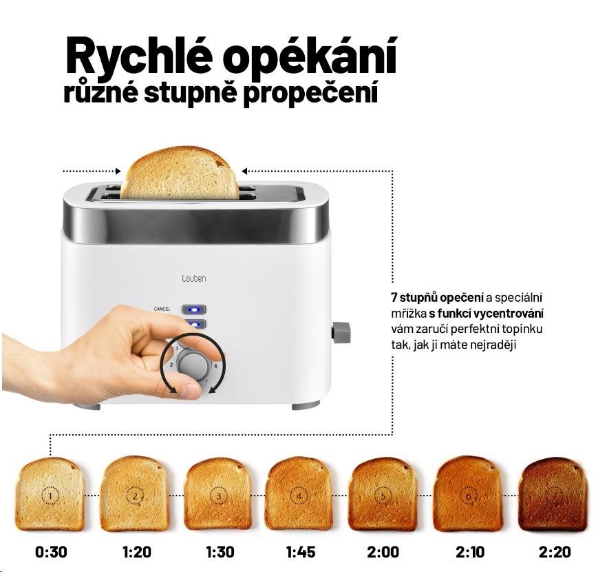 Ak ste milovníkmi chrumkavých toastov a topánok, Lauben Toaster posunie vaše raňajky na vyššiu úroveň. Na výber máte zo 7 stupňov opekania, takže či máte radšej topánky dôkladne prepečené až do hneda alebo len ľahko zlatavé, stačí nastaviť správne číslo. Skúšate nový druh pečiva a bojíte sa, že sa netrafíte? Nevadí. Proces opekania môžete kedykoľvek zastaviť tlačidlom Cancel. Poteší vás aj funkcia Reheat, ktorú oceníte najmä, keď v kuchyni specháte. Predstavte si, že pripravujete vajíčko Benedikt. Opečiete si topánku, ale potom vám príprava zakrytého vajíčka zaberie viac času, než ste očakávali. Topánku jednoducho znovu ohrejete na stupeň Reheat, bez toho aby ste ju spálili.