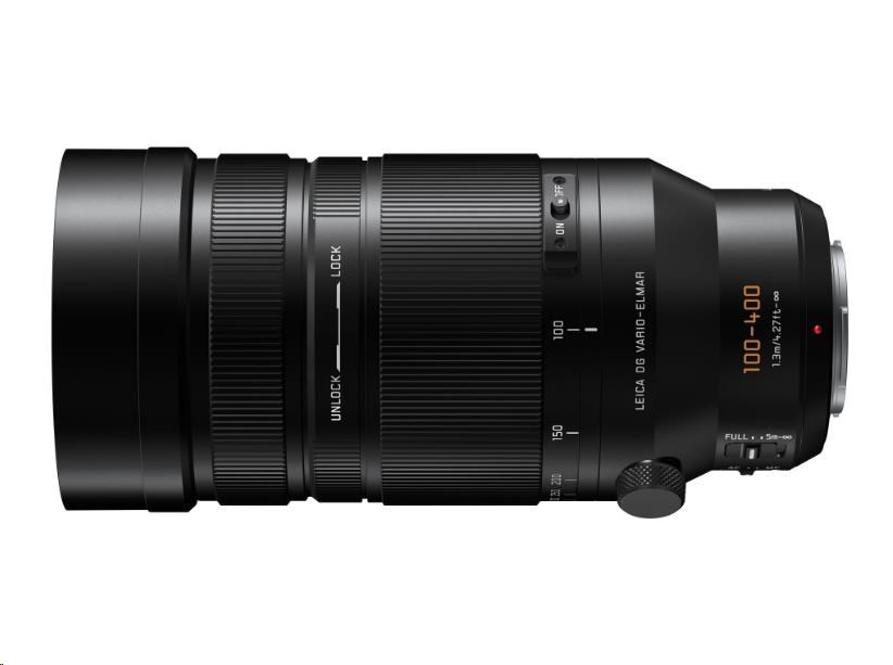 - LEICA DG VARIO-ELMAR 100-400mm / F4.0-6.3 II ASPH. / POWER O.I.S. - 9 diaphragm blades aperture F4.0 – F22 - Closest Focusing Distance 130cm (Full) / 500cm (Limit) - Maximum Magnification 0.25x / 0.5x (35mm equivalent) - Teleconvertor lens DMW-TC14 (1,4x magnification), DMW-TC20 (2.0x magnification) compatible - Fully optimized for video, dynamic aperture, quiet operation, smooth focus tracking - Focus Breathing Suppression, Linear/Non-linear focus ring control - Resistance to weather conditions, rain, dust, frost -10°C, Nano Surface Coating - 20 elements in 13 groups (1x Aspherical ED, 1x UED, 2x ED lens) - Dimensions – max. diameter 83mm, length 171.5mm, weight 985g - Filter Size 72mm.