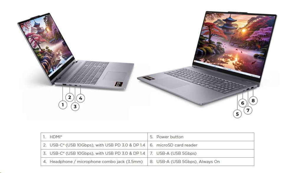 | Standartné porty | 1x USB-A (USB 5Gbps / USB 3.2 Gen 1) 1x USB-A (USB 5Gbps / USB 3.2 Gen 1), Always On 2x USB-C® (USB 10Gbps / USB 3.2 Gen 2), with USB PD 3.0 and DisplayPort™ 1.4 1x HDMI® 1.4b 1x Headphone / microphone combo jack (3.5mm) 1x microSD card reader |