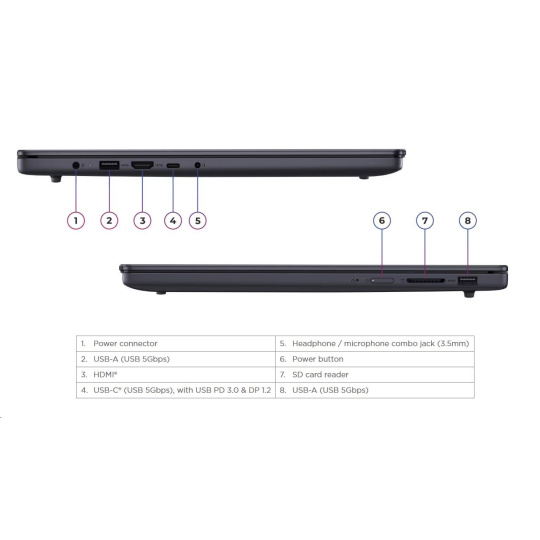 | Standartné porty | 2x USB-A (USB 5Gbps / USB 3.2 Gen 1) 1x USB-C® (USB 5Gbps / USB 3.2 Gen 1), with USB PD 3.0 and DisplayPort™ 1.2 1x HDMI® 1.4 1x Headphone / microphone combo jack (3.5mm) 1x SD card reader 1x Power connector |
