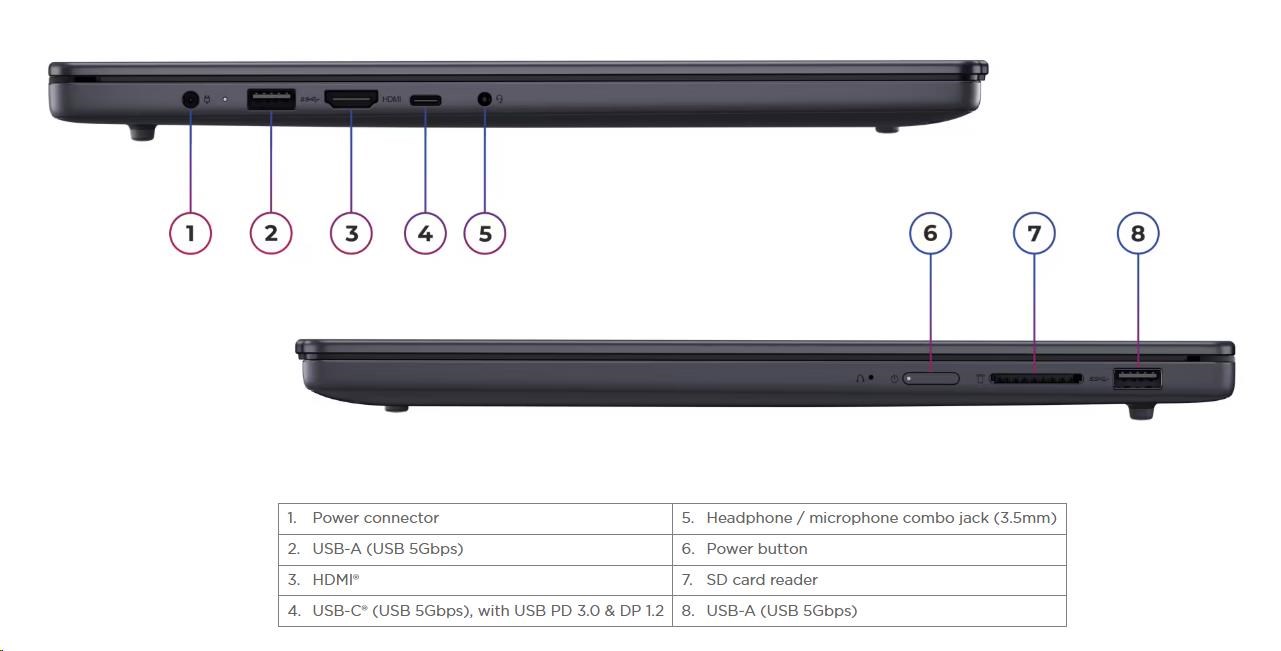 Standartné porty | 2x USB-A (USB 5Gbps / USB 3.2 Gen 1) 1x USB-C® (USB 5Gbps / USB 3.2 Gen 1), with USB PD 3.0 and DisplayPort™ 1.2 1x HDMI® 1.4 1x Headphone / microphone combo jack (3.5mm) 1x SD card reader 1x Power connector |