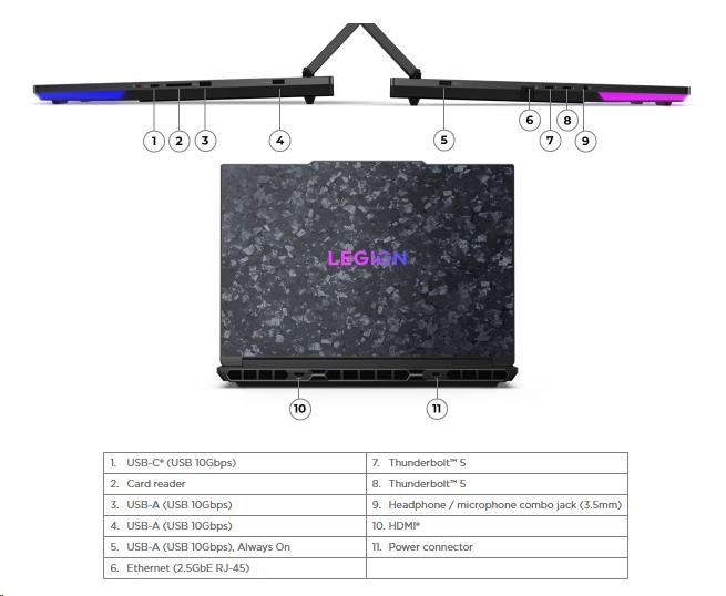 | Standartné porty | 2x USB-A (USB 10Gbps / USB 3.2 Gen 2) 1x USB-A (USB 10Gbps / USB 3.2 Gen 2), Always On 1x USB-C® (USB 10Gbps / USB 3.2 Gen 2) 2x USB-C® (Thunderbolt™ 5 / USB4® Version 2 80Gbps), with USB PD 95-100W and DisplayPort™ 2.1 1x HDMI® 2.1, up to 8K/60Hz 1x Headphone / microphone combo jack (3.5mm) 1x Ethernet (2.5GbE RJ-45) 1x Card reader 1x Power connector |