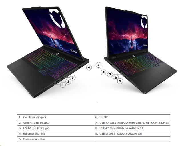 Standartné porty | 2x USB-A (USB 5Gbps / USB 3.2 Gen 1) 1x USB-A (USB 10Gbps / USB 3.2 Gen 2), Always On 1x USB-C® (USB 10Gbps / USB 3.2 Gen 2), with DisplayPort™ 2.1 1x USB-C® (USB 10Gbps / USB 3.2 Gen 2), with USB PD 65-100W and DisplayPort™ 2.1 1x HDMI® 2.1, up to 8K/60Hz 1x Headphone / microphone combo jack (3.5mm) 1x Ethernet (RJ-45) 1x Power connector |