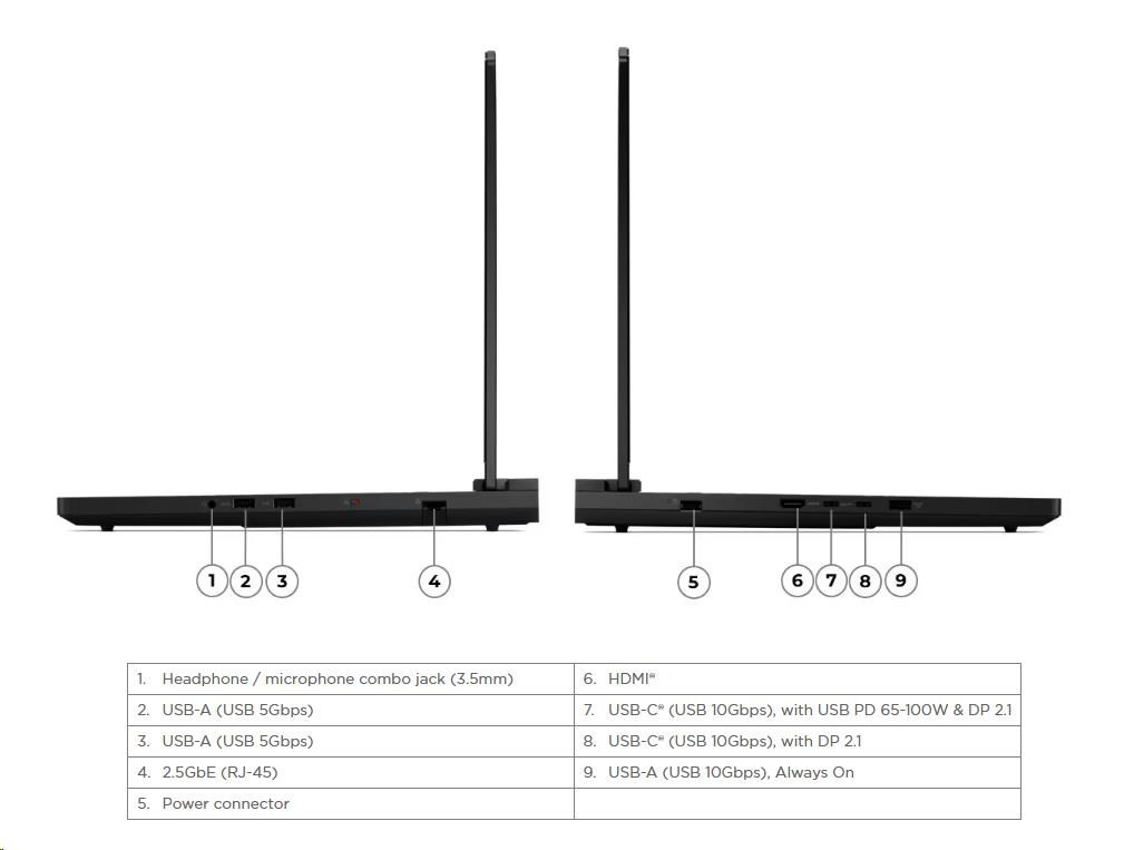 | Standartné porty | 1x USB-A (USB 5Gbps / USB 3.2 Gen 1) 1x USB-A (USB 5Gbps / USB 3.2 Gen 1), Always On 1x USB-C® (USB 5Gbps / USB 3.2 Gen 1) 1x USB-C® (USB 10Gbps / USB 3.2 Gen 2), with PD 140W and DisplayPort™ 1.4 1x USB-C® (Thunderbolt™ 4 / USB4® 40Gbps), with PD 140W and DisplayPort™ 1.4 1x HDMI® 2.1, up to 8K/60Hz 1x Headphone / microphone combo jack (3.5mm) 1x Card reader 1x Power connector |