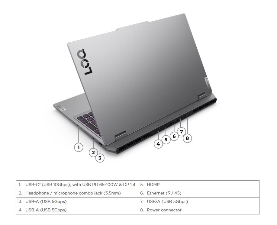 | Standartné porty | 3x USB-A (USB 5Gbps / USB 3.2 Gen 1) 1x USB-C® (USB 10Gbps / USB 3.2 Gen 2), with USB PD 65-100W and DisplayPort™ 1.4 1x HDMI® 2.1, up to 8K/60Hz 1x Headphone / microphone combo jack (3.5mm) 1x Ethernet (RJ-45) 1x Power connector |