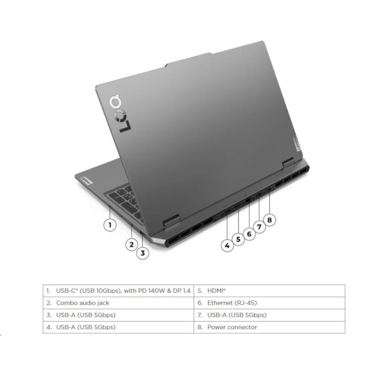 | Standartné porty | 3x USB-A (USB 5Gbps / USB 3.2 Gen 1) 1x USB-C® (USB 10Gbps / USB 3.2 Gen 2), with Lenovo® PD 140W and DisplayPort™ 1.4 1x HDMI® 2.1, up to 8K/60Hz 1x Headphone / microphone combo jack (3.5mm) 1x Ethernet (RJ-45) 1x Power connector |