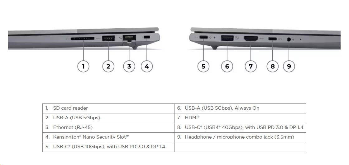 | Standartné porty | 1x USB-A (USB 5Gbps / USB 3.2 Gen 1) 1x USB-A (USB 5Gbps / USB 3.2 Gen 1), Always On 1x USB-C® (USB 10Gbps / USB 3.2 Gen 2), with USB PD 3.0 and DisplayPort™ 1.4 1x USB-C® (USB4® 40Gbps), with USB PD 3.0 and DisplayPort™ 1.4 1x HDMI® 2.1, up to 4K/60Hz 1x Headphone / microphone combo jack (3.5mm) 1x Ethernet (RJ-45) 1x SD card reader |