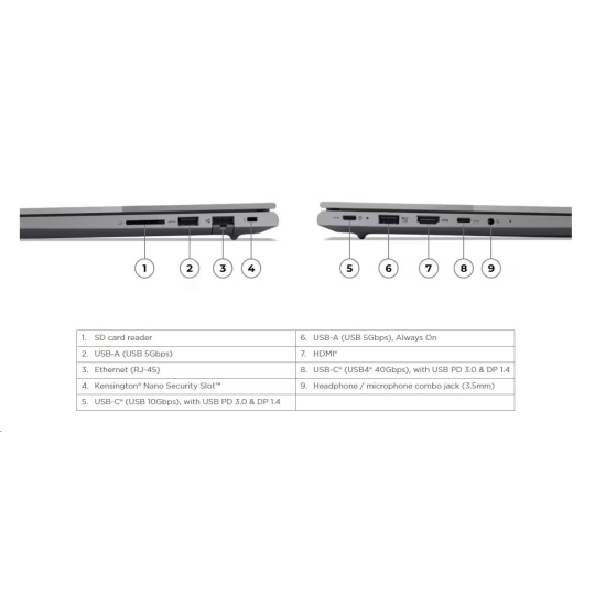 | Standartné porty | 1x USB-A (USB 5Gbps / USB 3.2 Gen 1) 1x USB-A (USB 5Gbps / USB 3.2 Gen 1), Always On 1x USB-C® (USB 10Gbps / USB 3.2 Gen 2), with USB PD 3.0 and DisplayPort™ 1.4 1x USB-C® (USB4® 40Gbps), with USB PD 3.0 and DisplayPort™ 1.4 1x HDMI® 2.1, up to 4K/60Hz 1x Headphone / microphone combo jack (3.5mm) 1x Ethernet (RJ-45) 1x SD card reader |