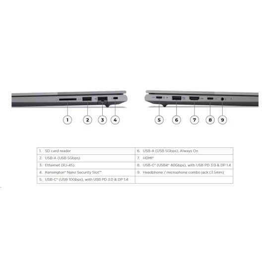 | Standartné porty | 1x USB-A (USB 5Gbps / USB 3.2 Gen 1) 1x USB-A (USB 5Gbps / USB 3.2 Gen 1), Always On 1x USB-C® (USB 10Gbps / USB 3.2 Gen 2), with USB PD 3.0 and DisplayPort™ 1.4 1x USB-C® (USB4® 40Gbps), with USB PD 3.0 and DisplayPort™ 1.4 1x HDMI® 2.1, up to 4K/60Hz 1x Headphone / microphone combo jack (3.5mm) 1x Ethernet (RJ-45) 1x SD card reader |