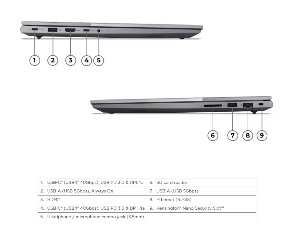 | Standartné porty | 1x USB-A (USB 5Gbps), Always On 1x USB-A (USB 5Gbps) 2x USB-C® (USB4® 40Gbps), with USB PD 3.0 and DisplayPort™ 1.4a 1x HDMI® 2.1, up to 4K/60Hz 1x Headphone / microphone combo jack (3.5mm) 1x Ethernet (RJ-45) 1x SD card reader |