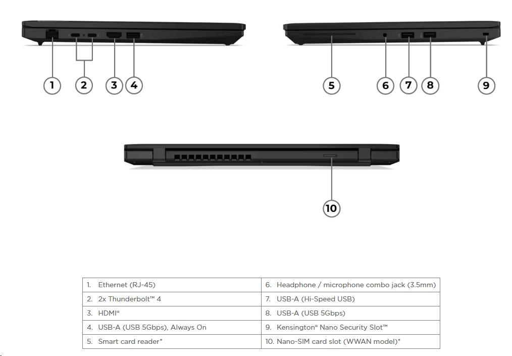 | Standartné porty | 1x USB-A (Hi-Speed USB / USB 2.0) 2x USB-A (USB 5Gbps / USB 3.2 Gen 1), one Always On 2x USB-C® (Thunderbolt™ 4 / USB4® 40Gbps), with USB PD 3.1 and DisplayPort™ 2.1 1x HDMI® 2.1, up to 4K/60Hz 1x Headphone / microphone combo jack (3.5mm) 1x Ethernet (RJ-45) |