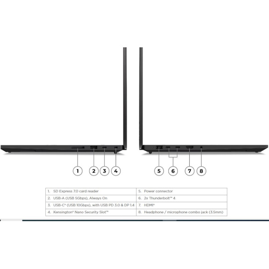 | Standartné porty | 1x USB-A (USB 5Gbps / USB 3.2 Gen 1), Always On 1x USB-C® (USB 10Gbps / USB 3.2 Gen 2), with USB PD 3.0 (135W input) and DisplayPort™ 1.4 2x USB-C® (Thunderbolt™ 4 / USB4® 40Gbps), with USB PD 3.0 (135W input) and DisplayPort™ 2.1 1x HDMI® 2.1, up to 8K/60Hz 1x Headphone / microphone combo jack (3.5mm) 1x SD Express 7.0 card reader 1x Security keyhole |