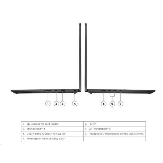 | Standartné porty | 1x USB-A (USB 10Gbps / USB 3.2 Gen 2), Always On 2x Thunderbolt™ 5, with USB PD 3.1 and DisplayPort™ 2.1, 140W input / 15W outpu 1x Thunderbolt™ 4, with DisplayPort™ 2.1 and USB PD 3.1, 140W input / 15W output 1x HDMI® 2.1, up to 8K/60Hz 1x Headphone / microphone combo jack (3.5mm) 1x SD Express 7.0 card reader |