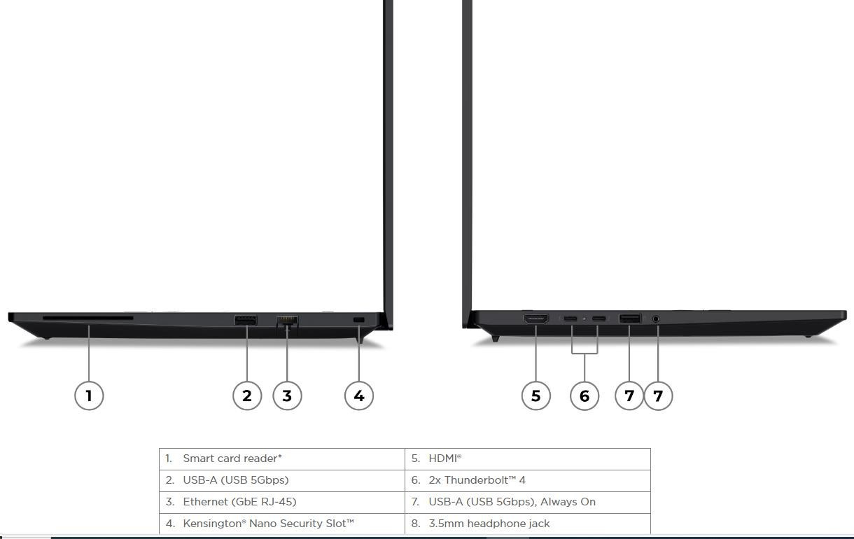 | Standartné porty | 1x USB-A (USB 5Gbps / USB 3.2 Gen 1) 1x USB-A (USB 5Gbps / USB 3.2 Gen 1), Always On 2x USB-C® (Thunderbolt™ 4 / USB4® 40Gbps), with USB PD 3.0 and DisplayPort™ 2.1 1x HDMI® 2.1, up to 4K/60Hz 1x Headphone / microphone combo jack (3.5mm) 1x Ethernet (RJ-45) 1x Security keyhole |