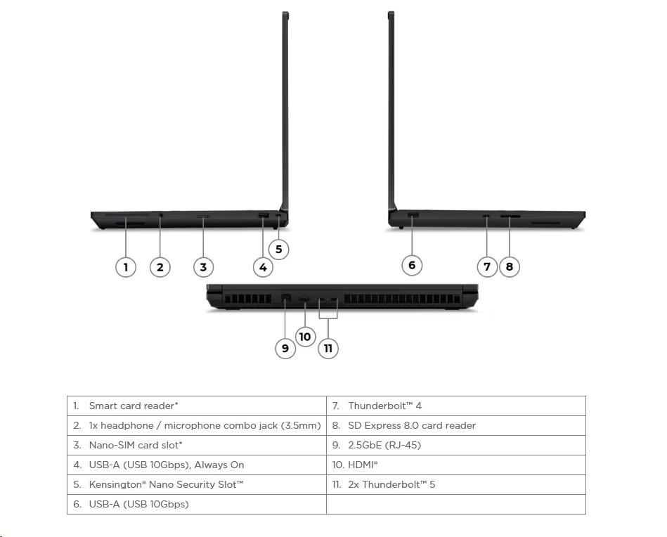 | Standartné porty | 1x USB-A (USB 10Gbps / USB 3.2 Gen 2), Always On 1x USB-A (USB 10Gbps / USB 3.2 Gen 2) 2x Thunderbolt™ 5, with DisplayPort™ 2.1 and USB PD 3.1, 180W input / 15W output 1x Thunderbolt™ 4, with DisplayPort™ 2.1 and USB PD 3.1, 180W input / 15W output 1x HDMI® 2.1, up to 8K/60Hz 1x Headphone / microphone combo jack (3.5mm) 1x Ethernet (2.5GbE RJ-45) 1x SD Express 8.0 card reader |