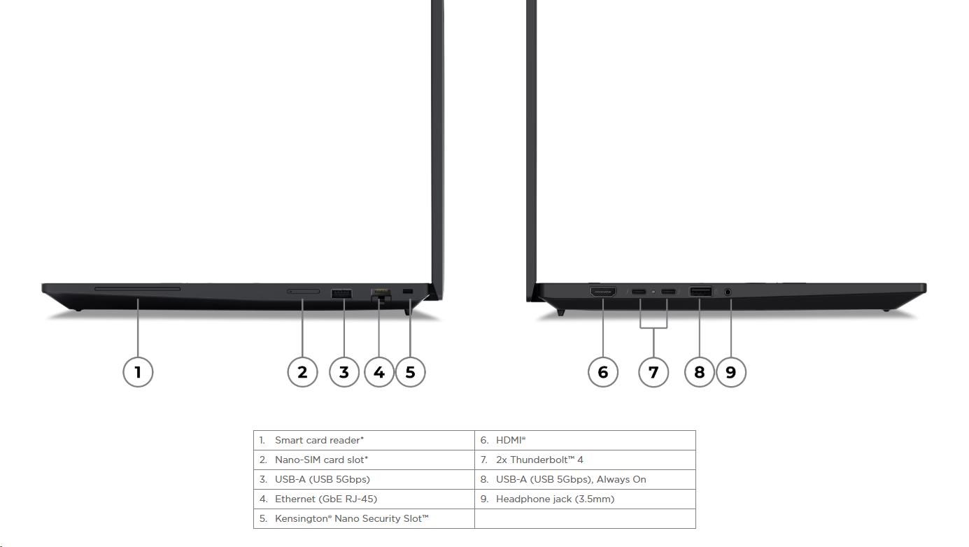 | Standartné porty | 1x USB-A (USB 5Gbps / USB 3.2 Gen 1) 1x USB-A (USB 5Gbps / USB 3.2 Gen 1), Always On 2x Thunderbolt™ 4, with USB PD 3.0 1x HDMI® 2.1, up to 4K/60Hz 1x Headphone / microphone combo jack (3.5mm) 1x Ethernet (GbE RJ-45) 1x Security keyhole 1x Smart Card Reader 1x Nano-SIM Card Slot |