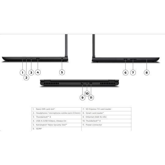| Standartné porty | 1x USB-A (USB 5Gbps / USB 3.2 Gen 1), Always On 2x USB-C® (Thunderbolt™ 4 / USB4® 40Gbps), with USB PD 3.0 and DisplayPort™ 2.1 1x HDMI® 2.1, up to 8K/60Hz 1x Headphone / microphone combo jack (3.5mm) 1x Ethernet (RJ-45) 1x SD Express 7.0 card reader 1x Security keyhole |