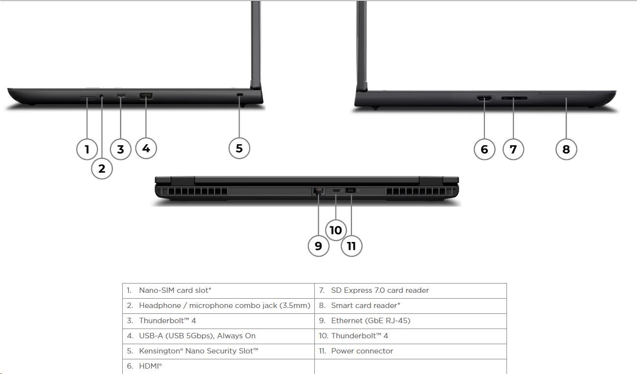 | Standartné porty | 1x USB-A (USB 5Gbps / USB 3.2 Gen 1), Always On 2x USB-C® (Thunderbolt™ 4 / USB4® 40Gbps), with USB PD 3.0 and DisplayPort™ 2.1 1x HDMI® 2.1, up to 8K/60Hz 1x Headphone / microphone combo jack (3.5mm) 1x Ethernet (RJ-45) 1x SD Express 7.0 card reader 1x Security keyhole |