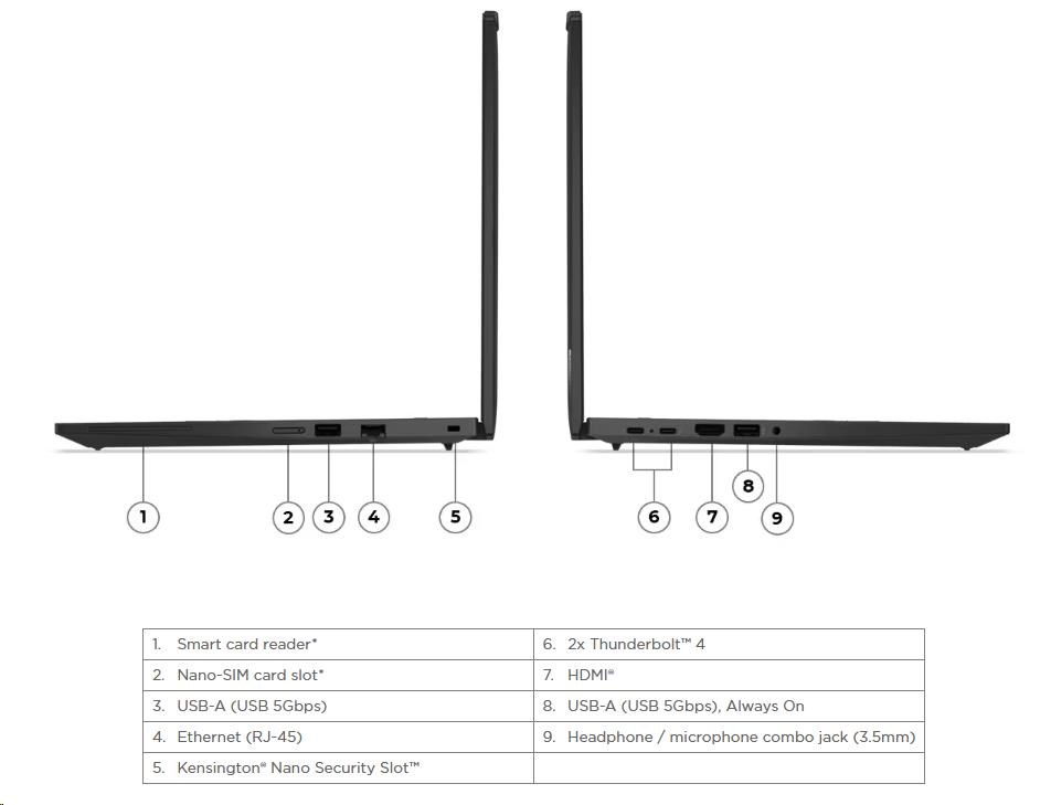 | Standartné porty | 1x USB-A (USB 5Gbps / USB 3.2 Gen 1) 1x USB-A (USB 5Gbps / USB 3.2 Gen 1), Always On 2x USB-C® (Thunderbolt™ 4 / USB4® 40Gbps), with USB PD 3.0 and DisplayPort™ 2.1 1x HDMI® 2.1, up to 4K/60Hz 1x Headphone / microphone combo jack (3.5mm) 1x Ethernet (RJ-45) |
