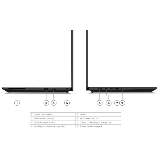 | Standartné porty | 1x USB-A (USB 5Gbps / USB 3.2 Gen 1) 1x USB-A (USB 5Gbps / USB 3.2 Gen 1), Always On 2x USB-C® (Thunderbolt™ 4 / USB4® 40Gbps), with USB PD 3.0 and DisplayPort™ 2.1 1x HDMI® 2.1, up to 4K/60Hz 1x Headphone / microphone combo jack (3.5mm) 1x Ethernet (RJ-45) 1x Security keyhole |