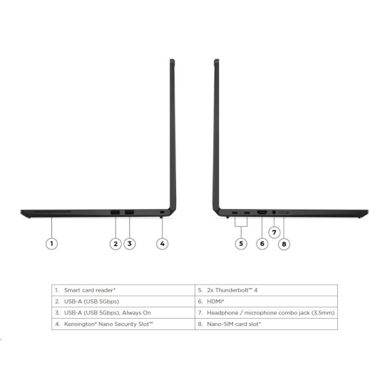| Standartné porty | 1x USB-A (USB 5Gbps / USB 3.2 Gen 1) 1x USB-A (USB 5Gbps / USB 3.2 Gen 1), Always On 2x USB-C® (Thunderbolt™ 4 / USB4® 40Gbps), with USB PD 3.0 and DisplayPort™ 2.1 1x HDMI® 2.1, up to 4K/60Hz 1x Headphone / microphone combo jack (3.5mm) 1x Smart Card Reader 1x Nano-SIM Card Slot |