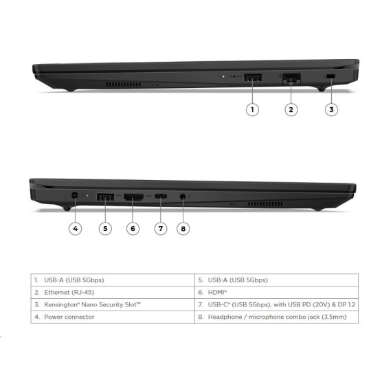 | Standardné porty | 2x USB-A (USB 5Gbps / USB 3.2 Gen 1) 1x USB-C® (USB 5Gbps / USB 3.2 Gen 1), s podporou USB Power Delivery (len 20V) a DisplayPort™ 1.2 1x HDMI® 1.4b 1x kombinovaný jack slúchadiel/mikrofónu (3,5 mm) 1x Ethernet (RJ-45) 1x napájací konektor |