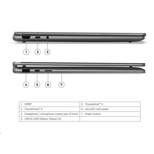 | Standartné porty | 1x USB-A (USB 5Gbps / USB 3.2 Gen 1), Always On 2x USB-C® (Thunderbolt™ 4 / USB4® 40Gbps), with USB PD 3.0 and DisplayPort™ 2.1 1x HDMI® 1.4b 1x Headphone / microphone combo jack (3.5mm) 1x microSD card reader |