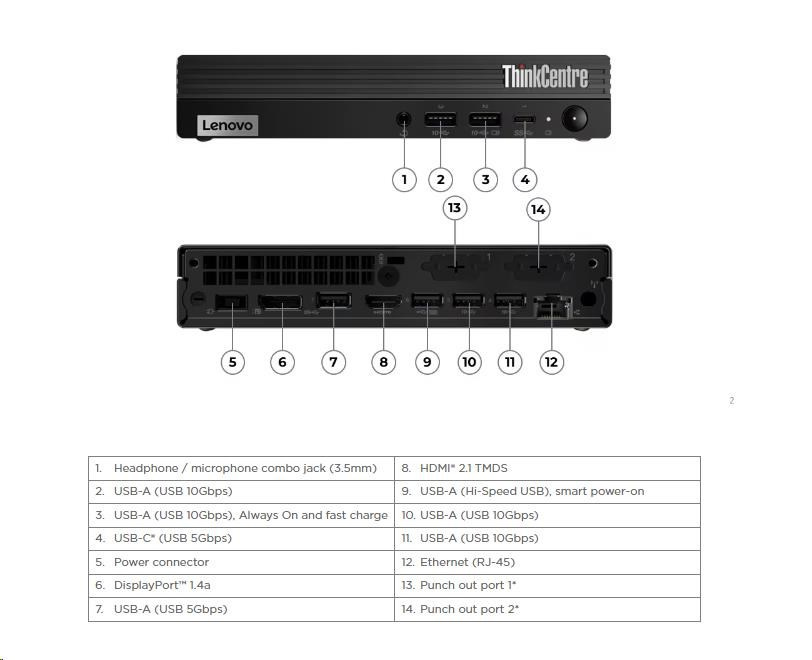 Predné porty | 1x USB-C® (USB 5Gbps / USB 3.2 Gen 1), with 5V@0.9A charging 1x USB-A (USB 10Gbps / USB 3.2 Gen 2), with Always On and 5V@2.1A charging 1x USB-A (USB 10Gbps / USB 3.2 Gen 2) 1x headphone / microphone combo jack (3.5mm) |